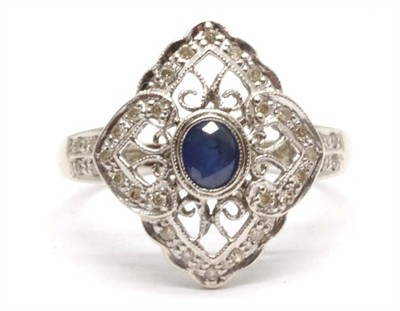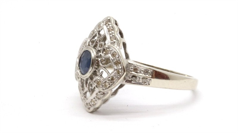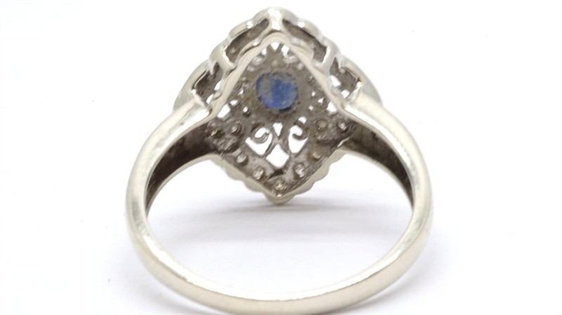 Zlatý prsten s diamanty a safírem. Bílé zlato 375/1000. Přírodní safír 0,35 ct. Přírodní diamanty, kvalita SI2 - I1, barva I - J, celková váha 0,18 ct. Váha prstenu: 3,11 g. Velikost prstenu: 60.