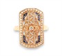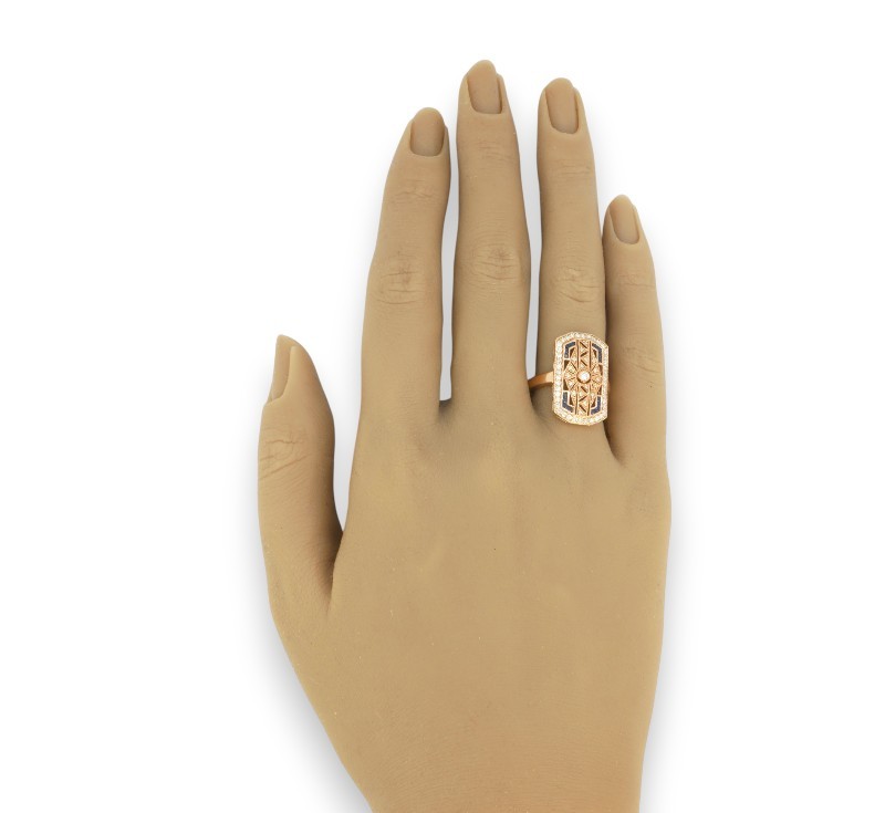 Prsten v art deco tvarosloví z růžového zlata ryzosti 585/1000 osazený safíry a diamanty briliantového brusu o celkové hmotnosti 0,38 ct (SI2/H). Celková hmotnost prstenu je 5,60 g. Velikost 54.