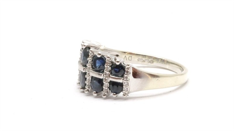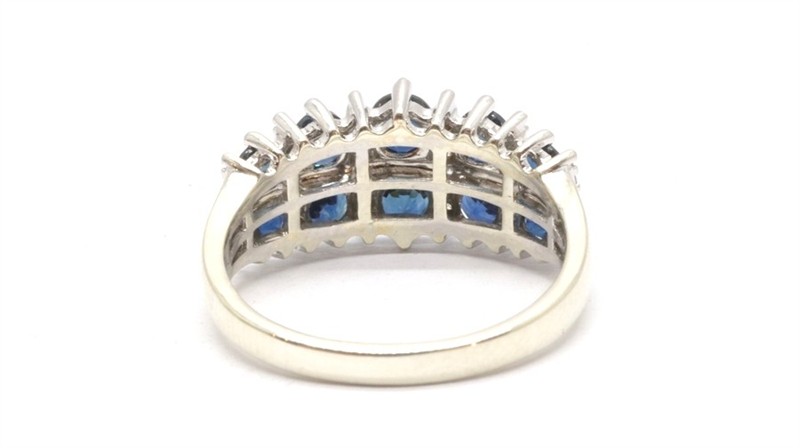 Zlatý prsten s diamanty a safíry. Bílé zlato 375/1000. Přírodní safíry, celková váha 1,2 ct. Přírodní diamanty, kvalita SI1 - SI2, barva H - I, celková váha 0,12 ct. Váha prstenu: 4,14 g. Velikost prstenu: 55.