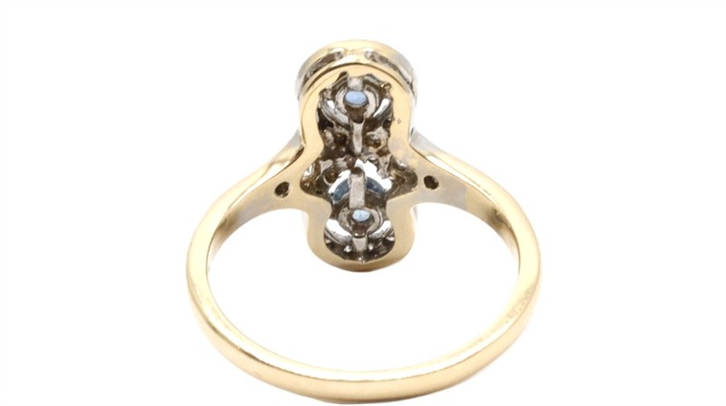 Zlatý prsten s diamanty a safíry. Žluté a bílé zlato 375/1000. Přírodní safíry, celková váha 0,3 ct. Přírodní diamanty, kvalita SI1 - SI2, barva H - J, celková váha 0,3 ct. Váha prstenu: 3,43 g. Velikost prstenu: 56.