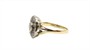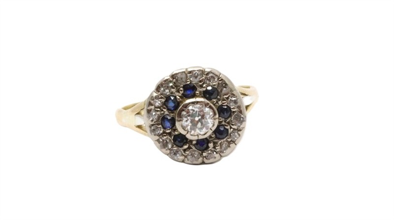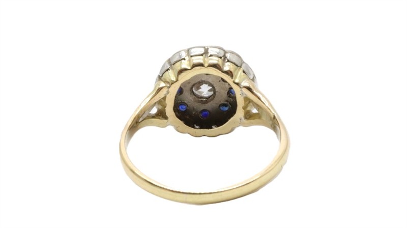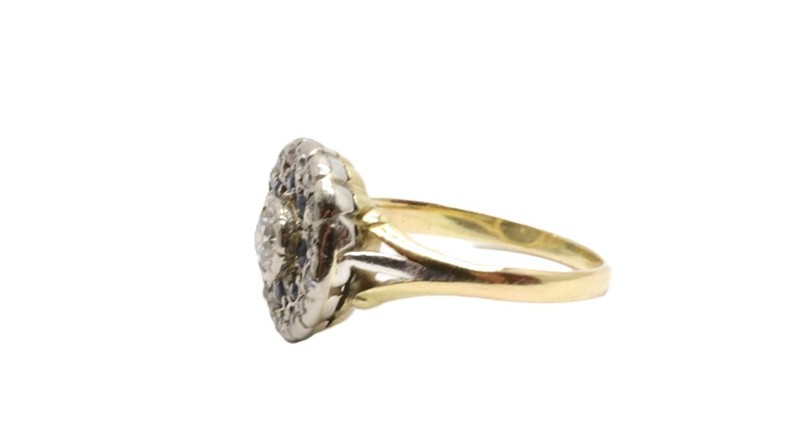 Zlatý prsten s diamanty a safíry. Bílé a žluté zlato 680/1000, 750/1000. Přírodní safíry, celková váha 0,2 ct. Přírodní diamanty - starý brus, kvalita SI1 - SI2, barva I - J, celková váha 0,38 ct (centrální diamant 0,23 ct). Váha prstenu: 3,19 g. Velikost prstenu: 49. Osvědčení puncovního úřadu.