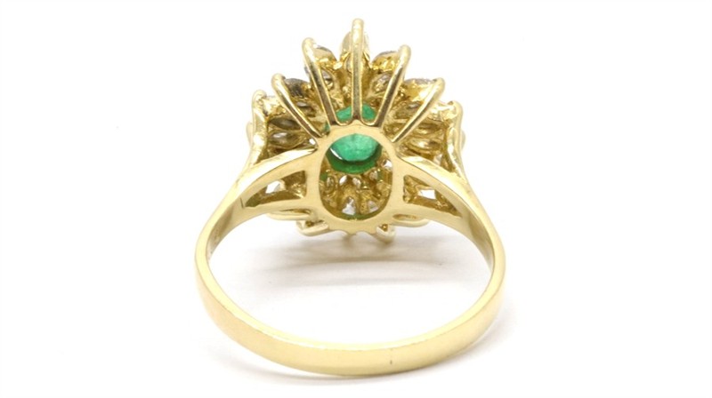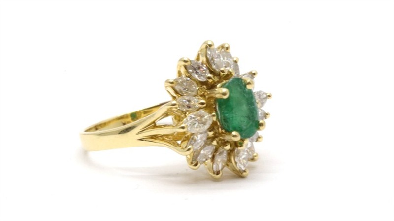 Zlatý prsten s diamanty a smaragdem. Žluté zlato 750/1000. Přírodní smaragd. celková váha 0,74 ct. Přírodní diamanty, kvalita SI1 - SI2, barva H - I, celková váha 0,95 ct. Váha prstenu: 5,01 g. Velikost prstenu: 53.