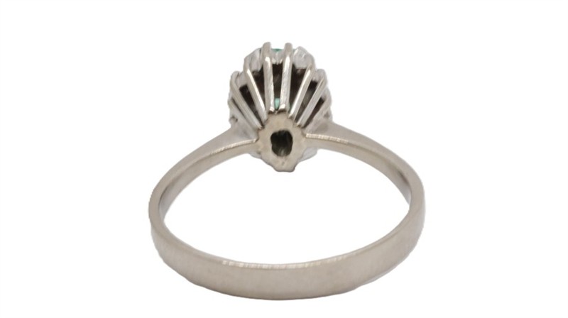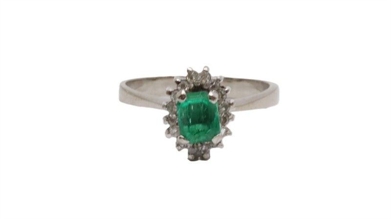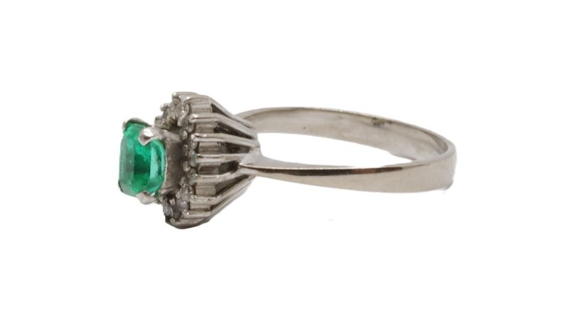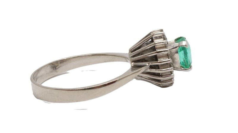 Zlatý prsten s diamanty a smaragdem. Bílé zlato 500/1000. Přírodní smaragd 0,6 ct. Přírodní diamanty, kvalita SI1 - SI2, barva H - I, celková váha 0,15 ct. Váha prstenu: 4,13 g. Velikost prstenu: 57. Osvědčení puncovního úřadu.