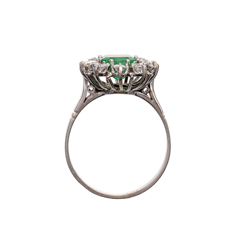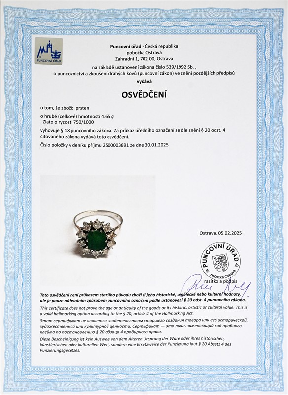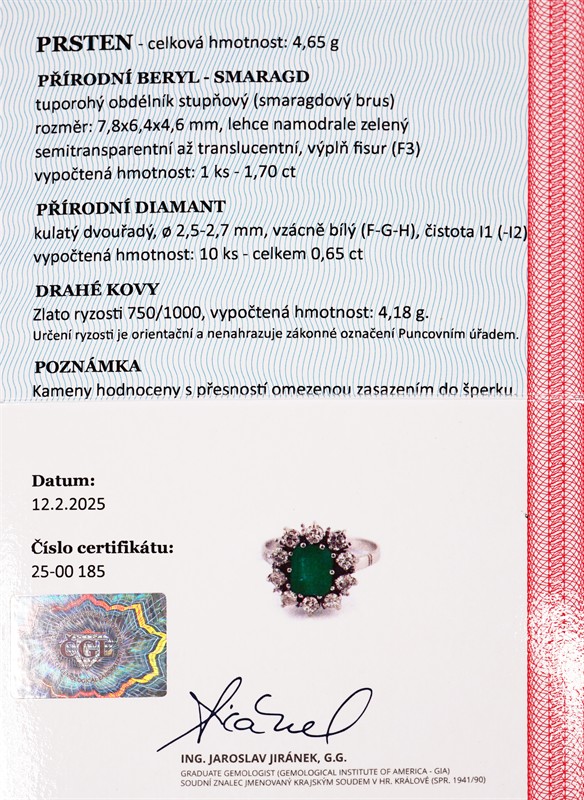 Materiál: bílé zlato o ryzosti 750/1000 Hmotnost: 4,65 g Rozměry: velikost prstenu 57, míry hlavy 1,4 x 1,5 cm Drahokamy: • 1 ks přírodní smaragd, cca 1,70 ct, rozměry cca 7,8 × 6,4 × 4,6 mm, smaragdový brus • 10 ks přírodních diamantů, celková hmotnost cca 0,65 ct, vzácně bílý (F-G-H), čistota I1 (I2), průměr 2,5-2,7 mm Stav: výborný Datace: kolem roku 1970 Doklady: • osvědčení Puncovního úřadu České republiky • certifikát gemologické laboratoře je součástí šperku Pro vaše maximální pohodlí nabízíme kompletní zlatnický servis: úpravy velikosti, odborné opravy, rhodiování, výměny kamenů, profesionální čištění, leštění i znalecké odhady. Vše přizpůsobíme vašim přáním.