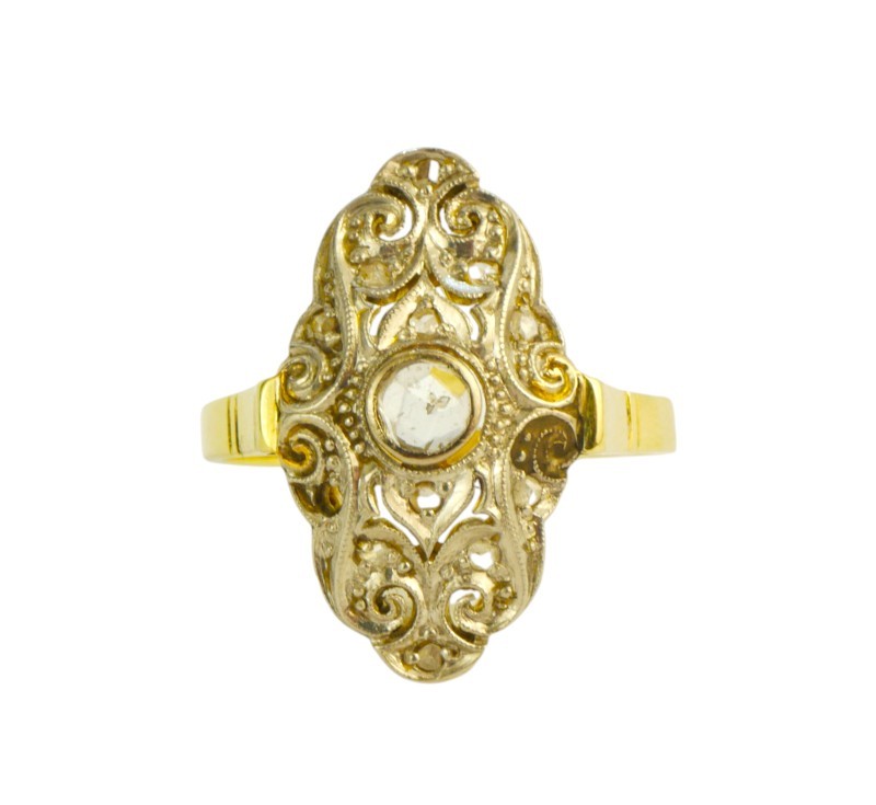 Prsten vyrobený ze zlata ryzosti 585/1000 zdobený centrálním diamantem (0,10 ct) a diamantovými routami. Diamanty jsou zasazeny v platině ryzosti 950/1000. Celková hmotnost 2,82 g. Velikost 52. K dispozici Osvědčení Puncovního úřadu.