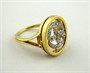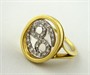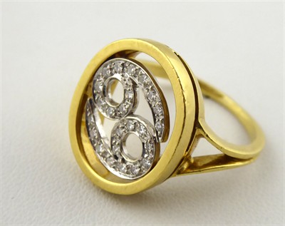 Zlato žluté a bílé 18 karátové, přírodní diamanty. Ryzost Au 750/1000, celková hmotnost 6,90 g. Prsten ze žluté zlata s obloukovitě profilovanou obroučkou a oválnou hlavou. Uprostřed ornament z bílého zlata znázorňující znamení horoskopu Raka či symbolizující lásku. Osázený 24 přírodními diamanty výbrusu Achtkant o hmotnosti 0,20 ct, barva G, čistota Si. Značeno: ryzost 750, platný český punc, italský punc s mistrovskou značkou. Itálie, třetí třetina minulého století. Velikost prstenu 56.