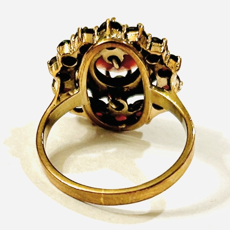 Honosný prsten s hlavicí připomínající kulatý květ, ve středu a při okraji osazeno přírodními granáty kulatého hvězdicového brusu, kontrastní kruh s přírodních bílo-šedých perel (půlperly), fasováno krapnami. Kvalitní německá zlatnická práce z 50. let 20. století. Zhotoveno z narůžovělého žlutého 8 karátového zlata, tj. o ryzosti 333/1000; nově opatřeno punc Z-59 (písmeno Z s květinou) a ryzostní číslo zevnitř šíny. Hmotnost 5,07 g, velikost 55, průměr hlavice 17 mm. Ve velmi zachovalém stavu, odborně vyčištěno a vyleštěno zlatníkem.