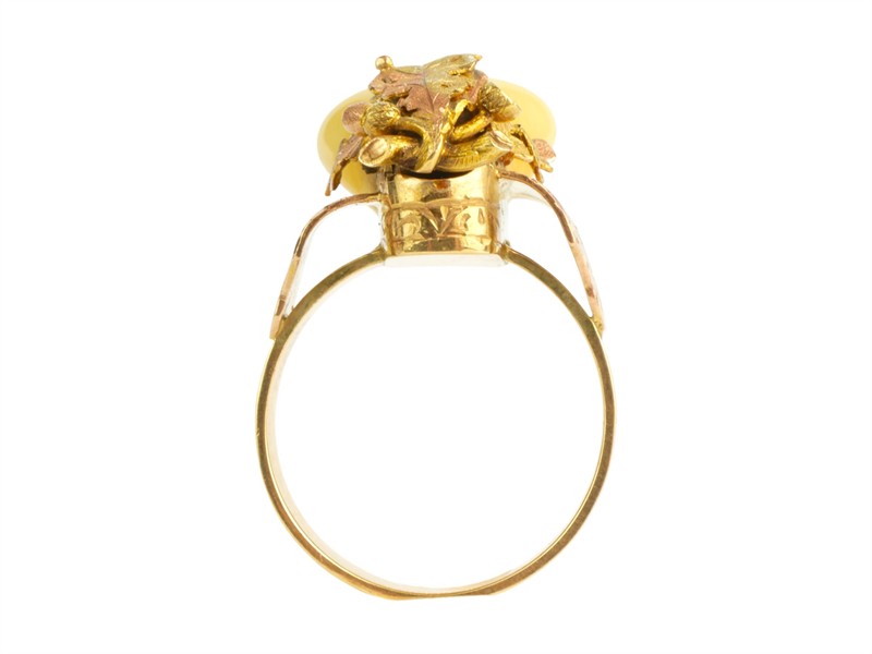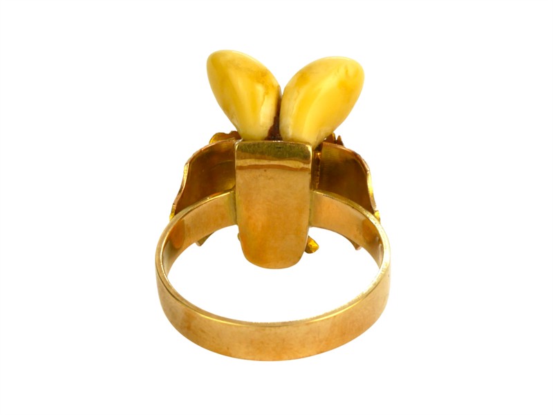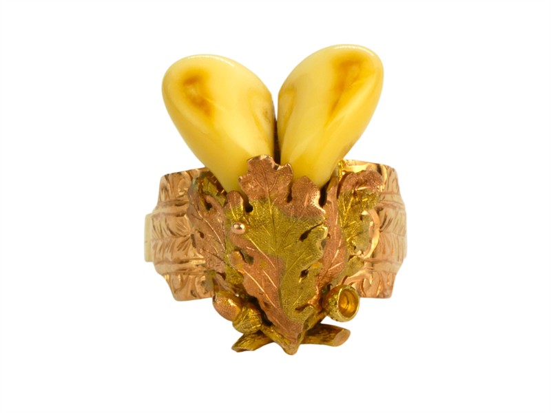 Lovecký prsten jehož středovou část s jeleními grandlemi doplňuje bohatý rostlinný dekor v podobě dubových listů a žaludů. Pečlivě vyvedené detaily jsou ukázkou vynikající zlatnické práce. Prsten o velikosti 65 je vyroben ze zlata o ryzosti 585/1000 a využívá kombinaci žlutého a růžového zlata pro zvýraznění detailů. jeho celková hmotnost je 11,44 g. Punc liška, mistrovská značka JVN.