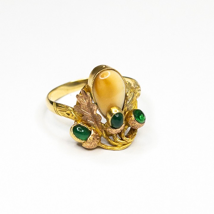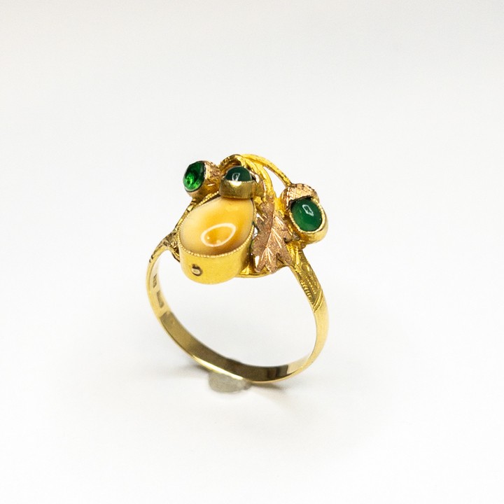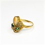 Krásný, výrazný zlatý prsten zdobený grandlí a chryzoprasem, nádherně řemeslně zpracovaný prsten je zdoben zeleným českým polodrahokamenem chrysoprasem a grandlí,hlava prstenu je zčásti gravírovaná, grandli zdobí tepané zlaté lístečky, prsten je vyroben ze zlata o ryzosti 14 karátů 585/1000 o celkové hmotnosti 6,57 g, velikost prstenu 65,