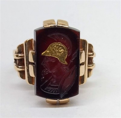 Zlatý prsten s mistrnou intaglií portrétu starořeckého hrdiny se zlatou přilbicí a zbrojí. Celková hmotnost Au 6,83 g/580/1000, otřelý punc liška (Z-27). nečitelná značka výrobce. Nádherná zlatnická práce. Rakousko-Uhersko, konec 19. století, rozměry hlavy prstenu 1,7 x 1,3 cm, velikost prstenu 56,5.