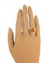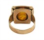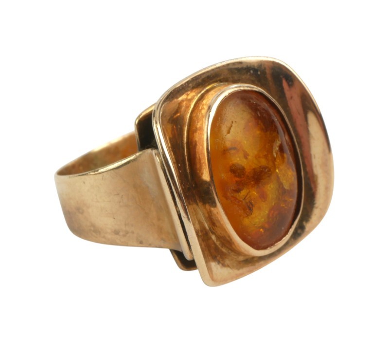 Výrazný zlatý prsten s jantarem, zlato ryzosti 333/1000, celková hmotnost prstenu 6,26 g. Velikost prstenu 51. Rozměry hlavy prstenu 1,8 a 1,8 cm.