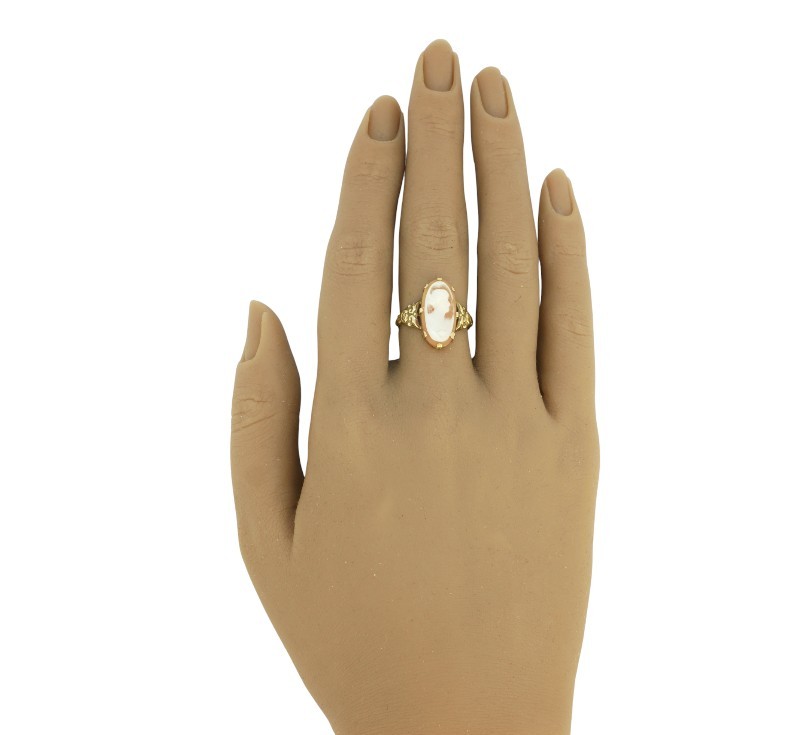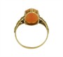 Prsten ze zlata ryzosti 585/1000 zdobený oválnou kamejí. Velikost prstenu 56. Rozměr hlavy prstenu 1,8 x 0,8 cm. Celková hmotnost 2,52 g.