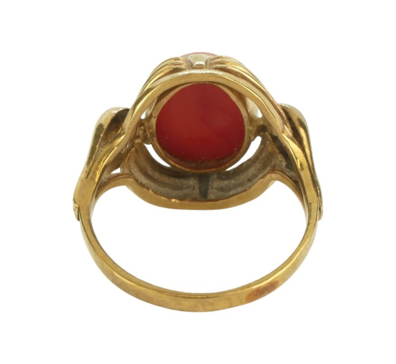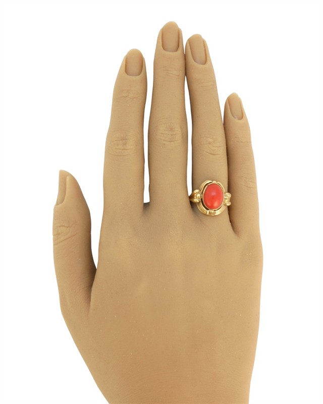 Prsten ze žlutého zlata ryzosti 333/1000 s červeným korálem. Celková hmotnost prstenu je 3,11 g a jeho velikost je 53. Ke šperku je vyhotoveno osvědčení Puncovního úřadu.
