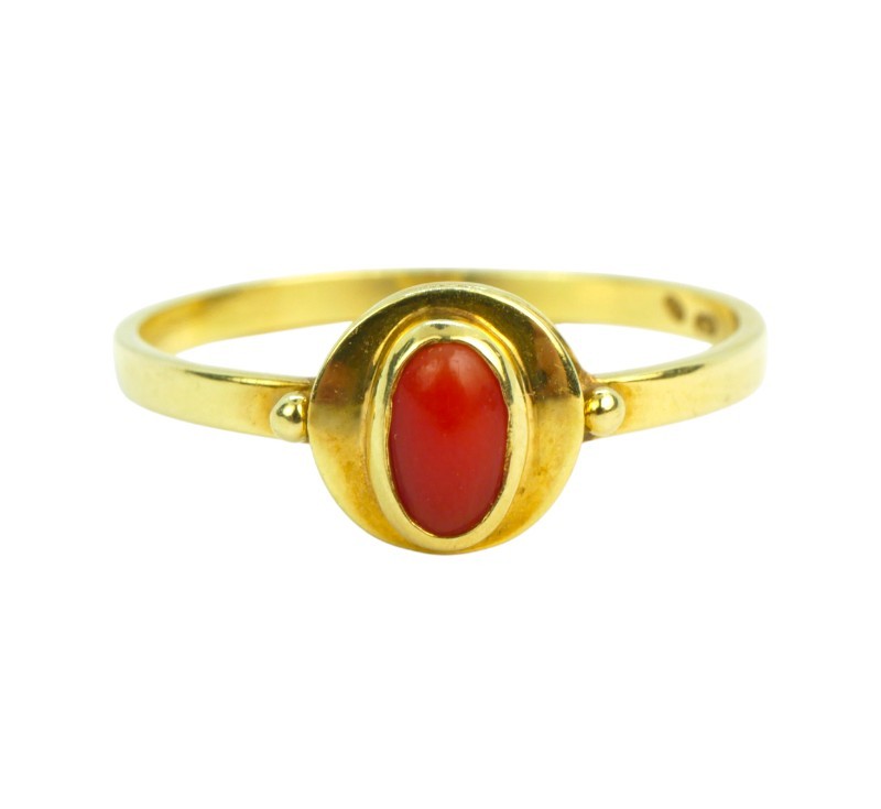 Prsten ze žlutého zlata ryzosti 585/1000 (punc labuť) zdobený korálem. Velikost 54, celková hmotnost 1,50 g.