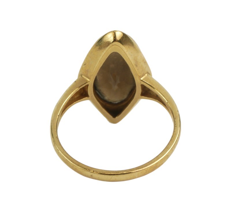 Zlatý prsten s hlavou ve tvaru loďky zdobenou kouřovým topazem. Zlato ryzost 37/5/1000, hmotnost prstenu 4,59 g. Velikost 56.