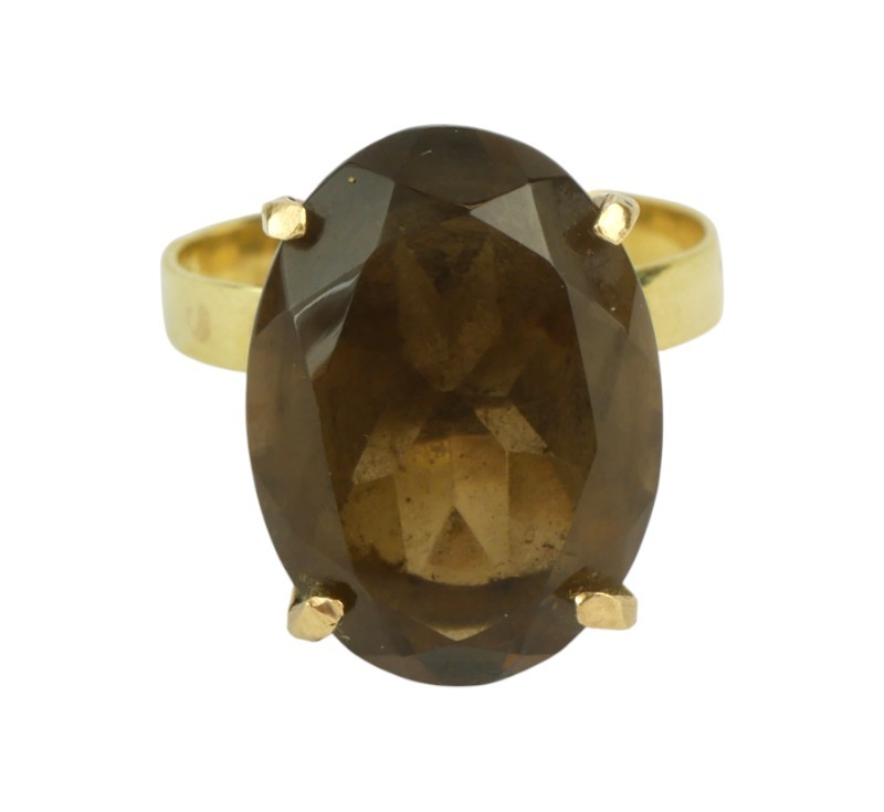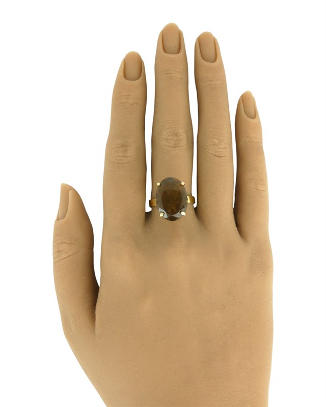 Prsten ze žlutého zlata dvou ryzostí 550 a 680/1000 zdobí kouřový topaz. Celková hmotnost prstenu 5,20 g. Velikost 61. Vyhotoveno osvědčení Puncovního úřadu.