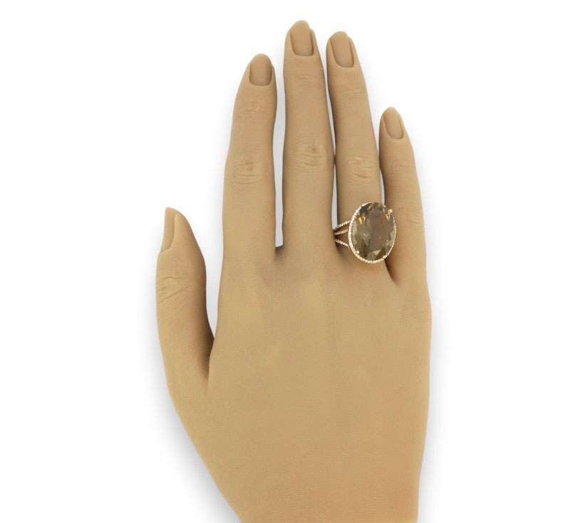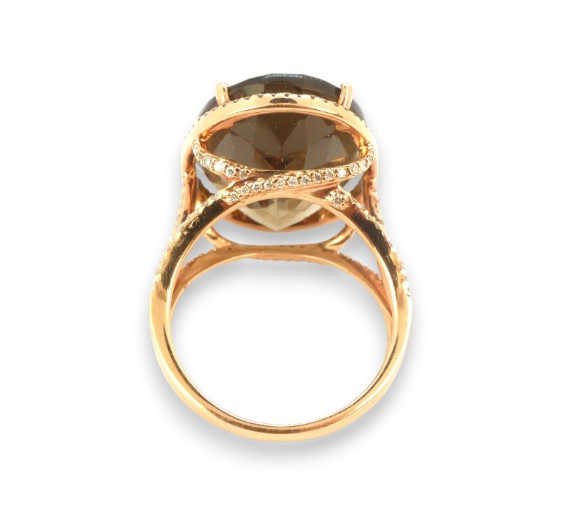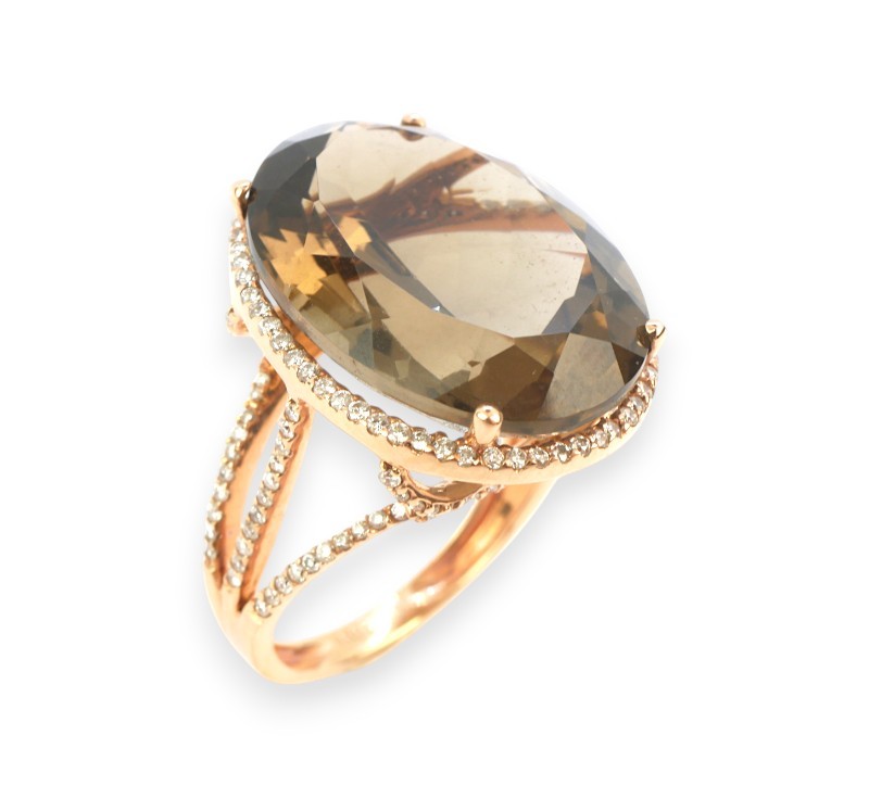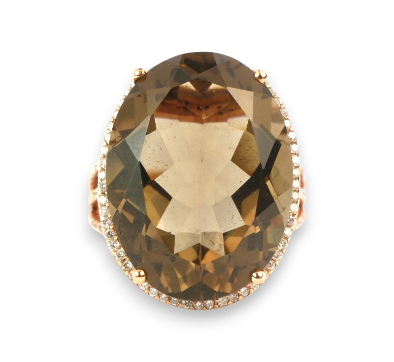 Prsten z růžového zlata ryzosti 585/1000 osazený kouřovým topazem o hmotnosti 16,87 ct a diamanty briliantového brusu o celkové hmotnosti 0,6 ct. Celková hmotnost prstenu je 7,06 g. Velikost 55.