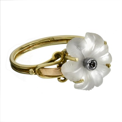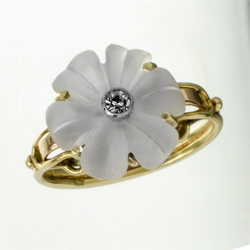 Prsten ze žlutého zlata zdobený vyřezávaným křišťálem ve tvaru květiny a drobným briliantem. Au 585/1000, 4,09g, briliant 0,10ct. Čechy, 30. léta 20. století. Velikost prstenu: 56, průměr kytičky cca1,5 cm.