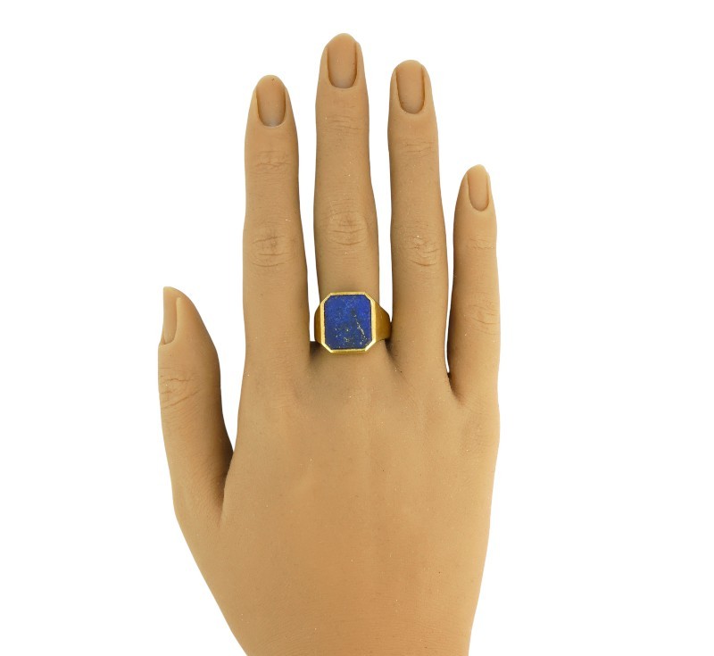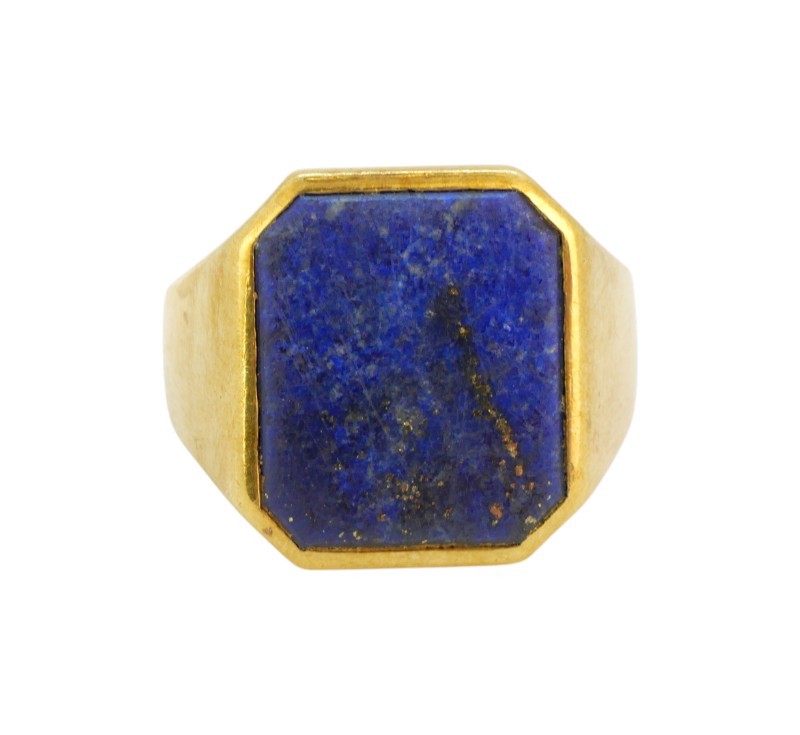 Masivní pánský prsten klasického střihu vyrobený ze žlutého zlata ryzosti 585/1000. V prstenu dominuje přírodní lapis lazuli (lazurit) sytě modré barvy s charakteristickými inkluzemi pyritu, které vytvářejí efekt „zlatého prachu“. Kámen je vybroušen do tvaru osmiúhelníku s plochým povrchem, ideálním pro případnou dodatečnou rytinu monogramu či erbu. Šína prstenu je hladká, v horní části se rozšiřující směrem k hlavici, s vysoce leštěným povrchem. Rozměry hlavy prstenu 1,7 x 1,4 cm. Značeno mistrovskou značkou CF. Velikost 63. Hmotnost 12,64 g.