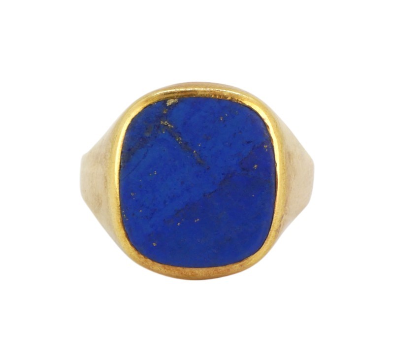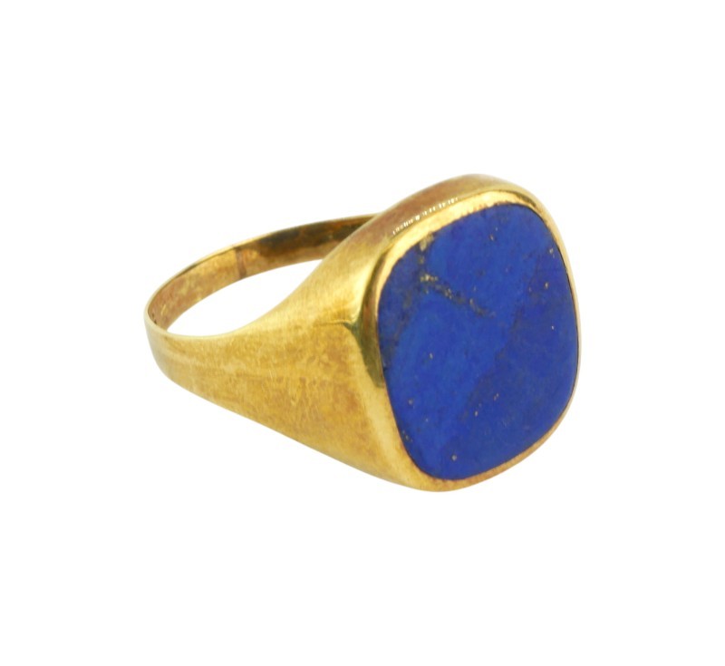 Prsten vyrobený ze žlutého zlata ryzosti 585/1000. Dominantou šperku je broušená destička přírodního lapis lazuli (lazuritu) intenzivní královské modři s jemnými inkluzemi zlatavého pyritu, připomínajícími noční oblohu. Rozměry hlavy prstenu 1,6 x 1,4 cm. Velikost 67, hmotnost 3,35 g. Tento typ prstenu byl v historii symbolem společenského postavení a dodnes zůstává vyhledávaným sběratelským kouskem i stylovým doplňkem pro náročné muže.