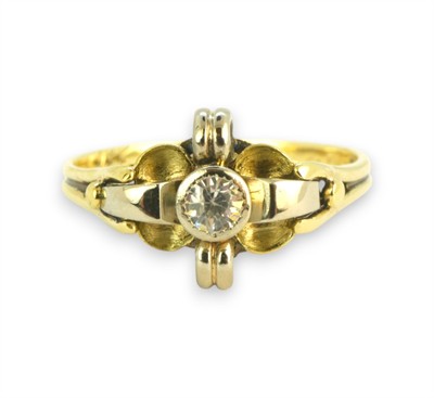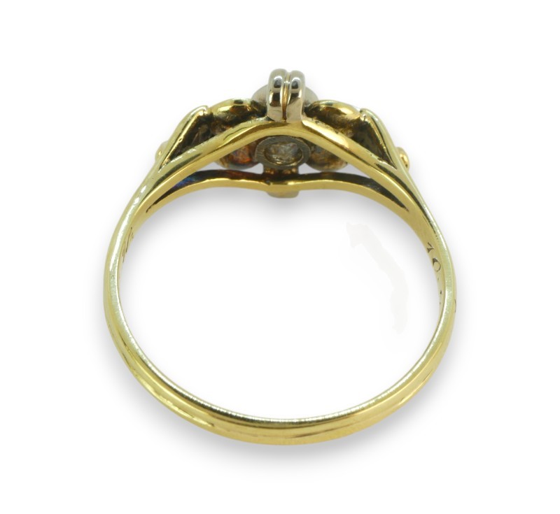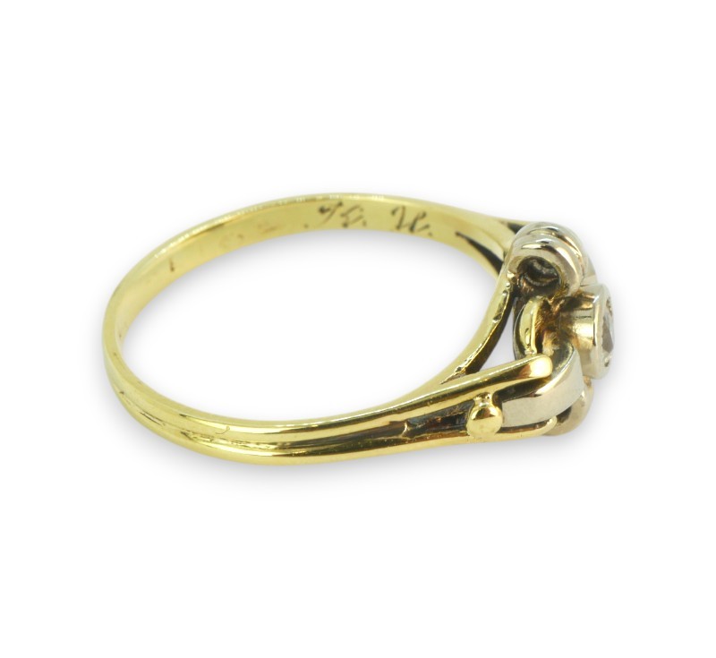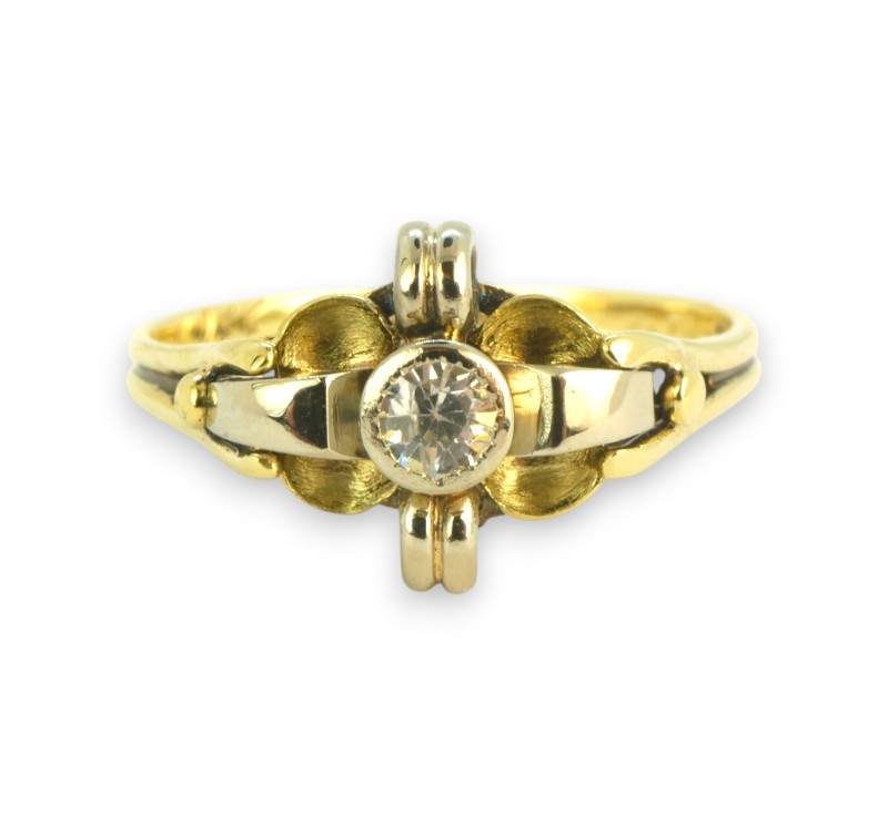 Prvorepublikový prsten s leukosafírem v art deco tvarosloví v kombinaci žlutého a bílého zlata ryzosti 585/1000 (punc lvíček). Celková hmotnost 2,40 g. Velikost 53.