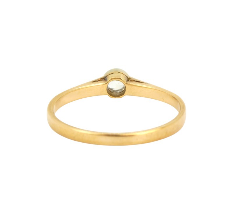 Prsten vyrobený ze zlata ryzosti 585/1000 (punc lvíček) zdobený lukosafírem. Velikost 52. Hmotnost 1,37 g. Prvorepublikový prsten, výborný stav.