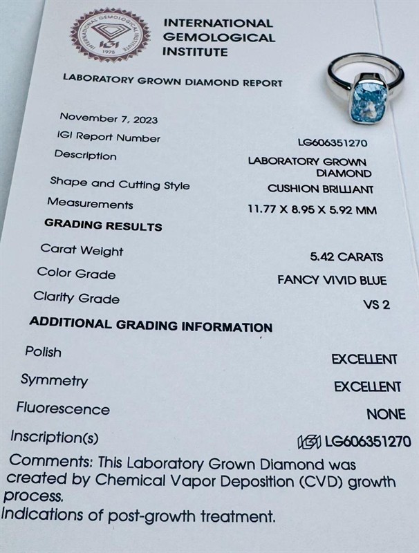 Zlatý prsten s modrým laboratorním diamantem - cushion 5,42 ct. IGI certifikát, barva fancy vivid blue = nejvyšší hodnocení barvy, čistota VS2 , prsten je vyrobený ze 14k zlata o váze 6,6 gramů, prsten má velikost 54.