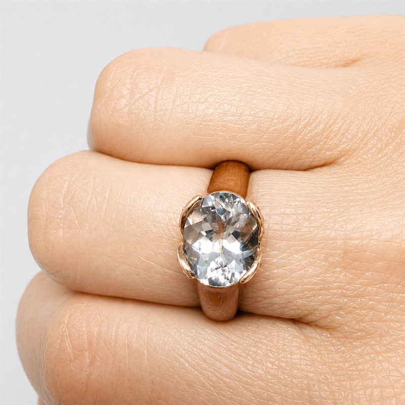 Půvabný,elegantní prsten ze zlata růžového odstínu. Šperk byl vyroben z masivního zlata ryzosti 375/1000. Celková váha 4,45 g Šperk je osazen jiskrnným,mistrně vybroušeným morganitam jemného fialovorůžového odstínu. Drahý kámen je přírodního původu. Šína je nevšedně v horní části zdobena plastickým květem osazeným čirými kameny briliantového brusu. Velikost 53,5 . Perfektní stav.