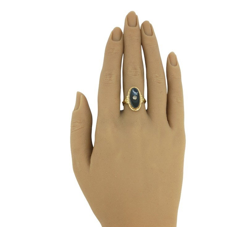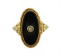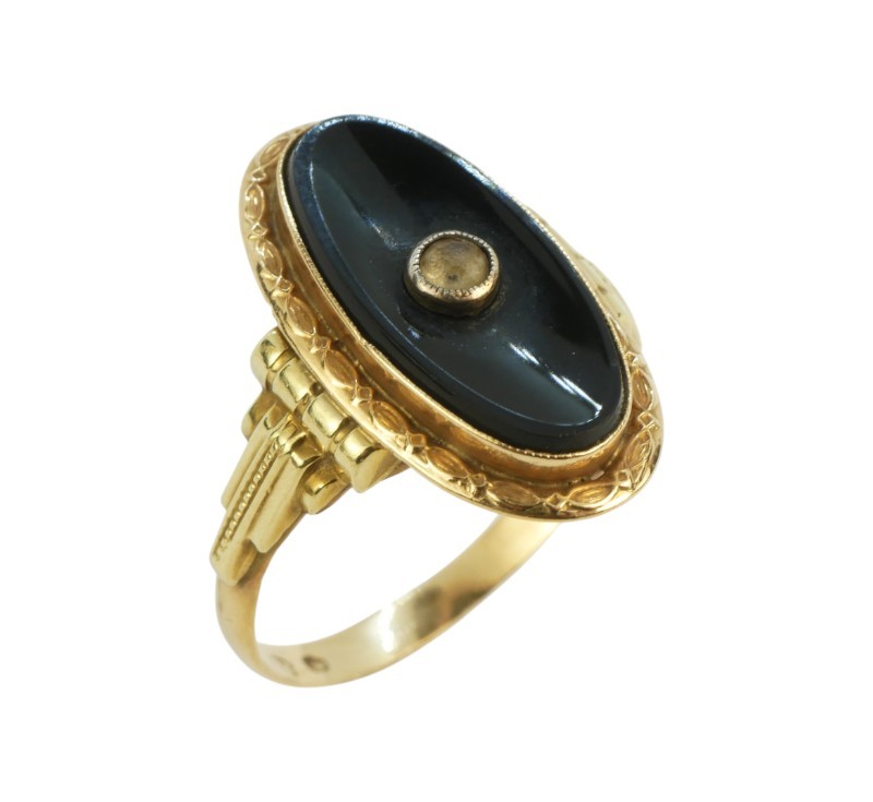 Prsten ze zlata ryzosti 585/1000 zdobený onyxem a středovým leukosafírem. Velikost prstenu 59. Rozměr hlavy prstenu 2,1 x 1,1 cm. Celková hmotnost 2,84 g.