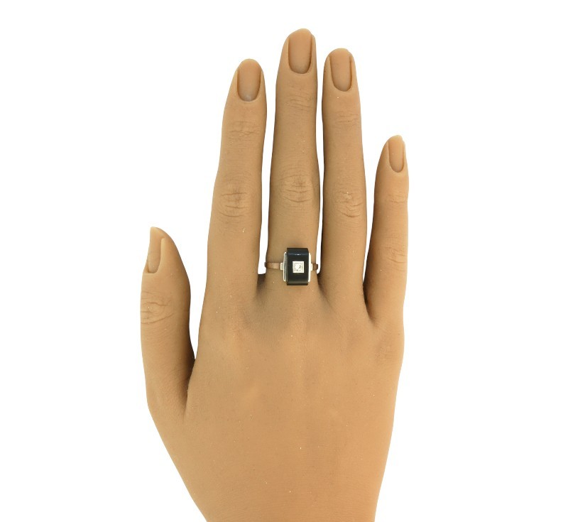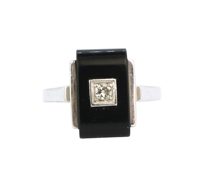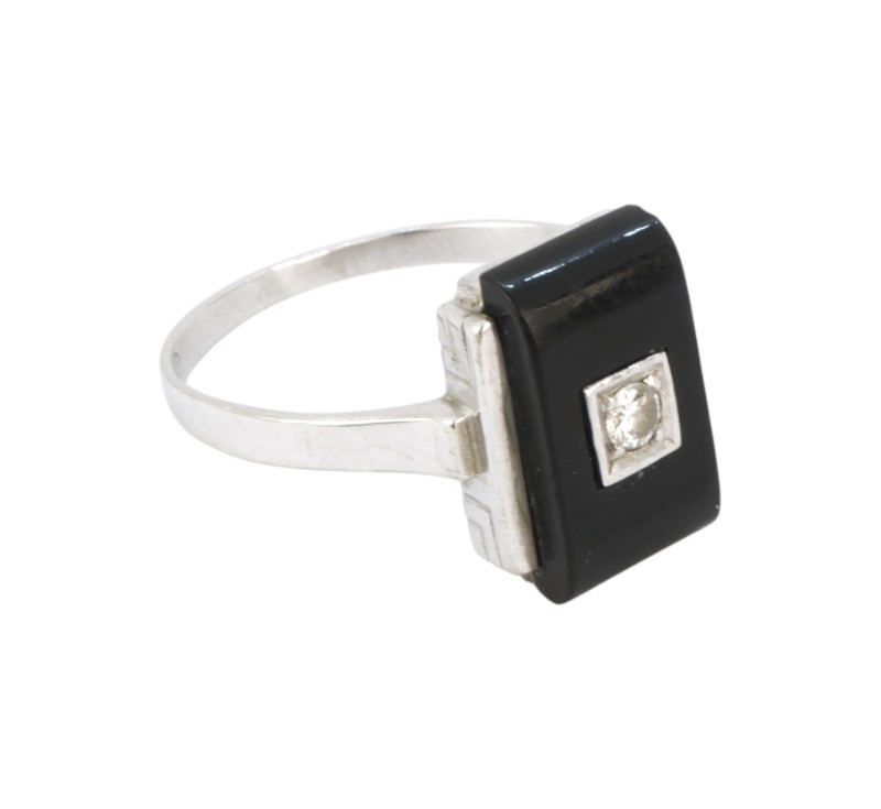 Prstren z bílého zlata ryzosti 750/1000 zhdobí obdélníkový plátek onyxu, v jehož středu je zasazen drobný přídoní diamant briliantového brusu a hmotnosti 0,05 ct. Velikost prstenu 55, celková hmotnost 2,84 g. Nadčasový šperk příjemného geometrického tvarosloví.