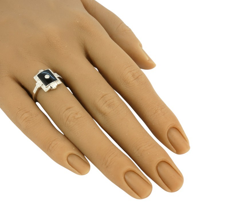 Prsten z bílého zlata ryzosti 585/1000 s onyxem a diamanty briliantového brusu o celkové hmotnosti 0,20 ct. Celková hmotnost prstenu je 3,06 g. Velikost 53.