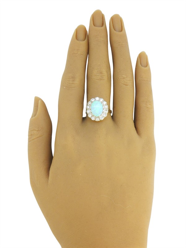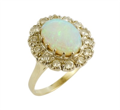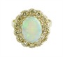 Prsten z bílého zlata ryzosti 585/1000 osazený oválným opálem lemovaným diamanty briliantového brusu o celkové hmotnosti 0,80 - 0,90 ct. Celková hmotnost prstenu je 4,60 g. Velikost 58.