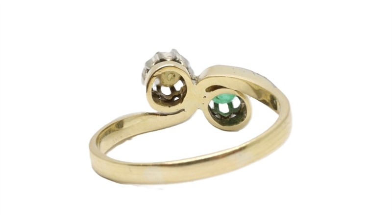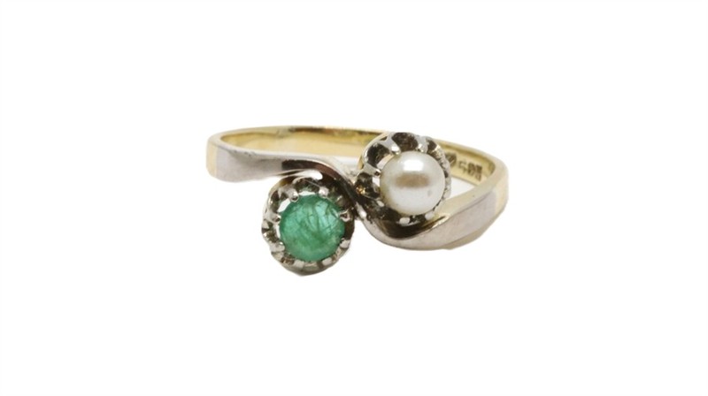 Zlatý prsten s perličkami a rubíny. Žluté a bílé zlato 585/1000. Perlička. Přírodní smaragd 0,25 ct. Váha prstenu: 4,41 g. Velikost prstenu: 61.