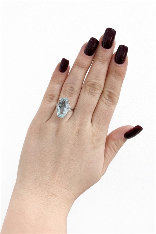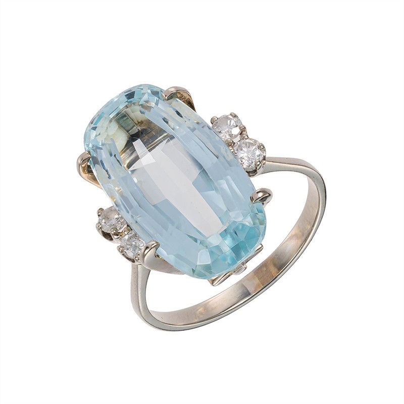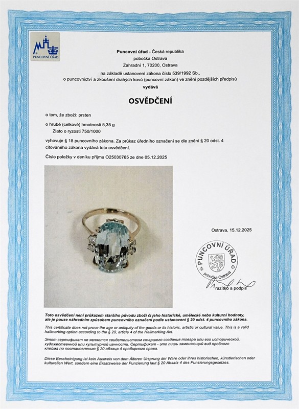 Drahokamy: - 1 ks přírodního akvamarínu, celkem 10,00 ct, - 4 ks přírodních diamantů, celkem 0,24 ct