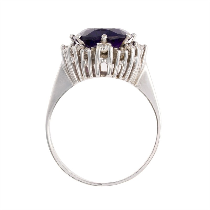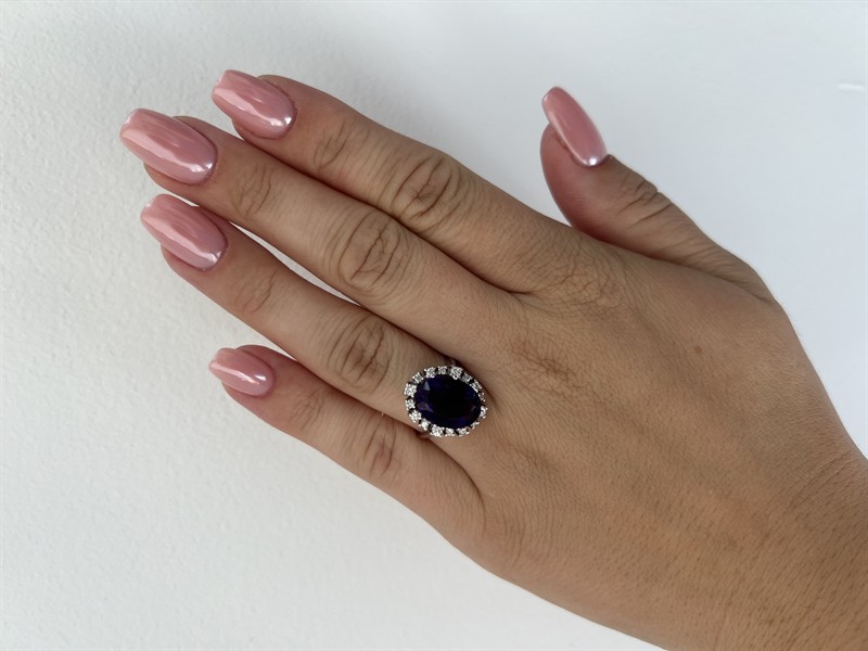 Zlato o ryzosti 585/1000 váha 5,69 g přírodní ametyst 1 ks 4,65 ct přírodní diamanty 12 ks 0,26 ct, 4 ks 0,16 ct velikost 57,5 míry hlavy 1,7 x 1,5 cm výborný stav osvědčení puncovního úřadu kameny s garancí pravosti zkontrolované v gemologické laboratoři