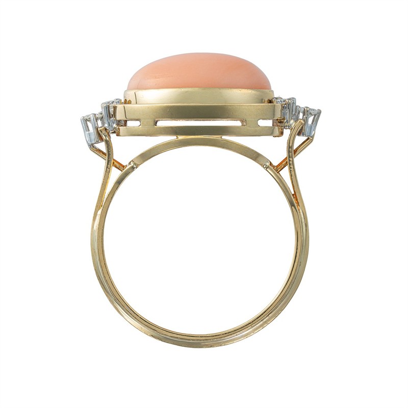 Žluté zlato o ryzosti 750/1000 váha 5,65 g velikost 57 míry hlavy 2,2 x 1,3 cm přírodní korál cca 6,00 ct přírodní diamant 6 ks 0,18 ct výborný stav osvědčení puncovního úřadu kameny s garancí pravosti zkontrolované v gemologické laboratoři