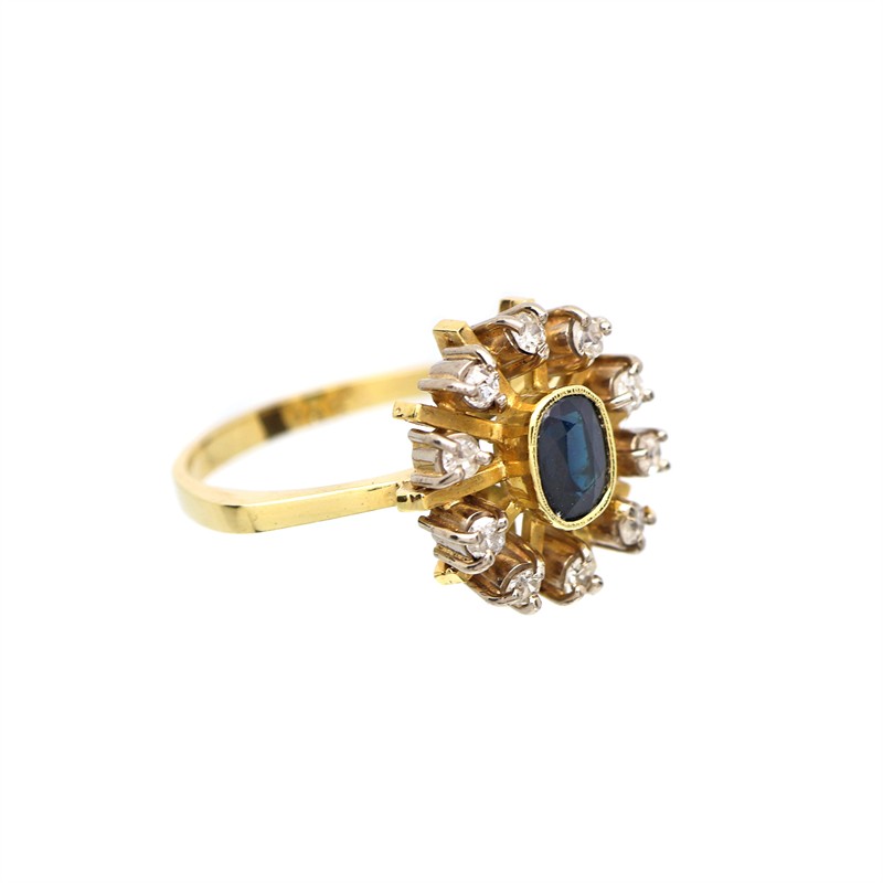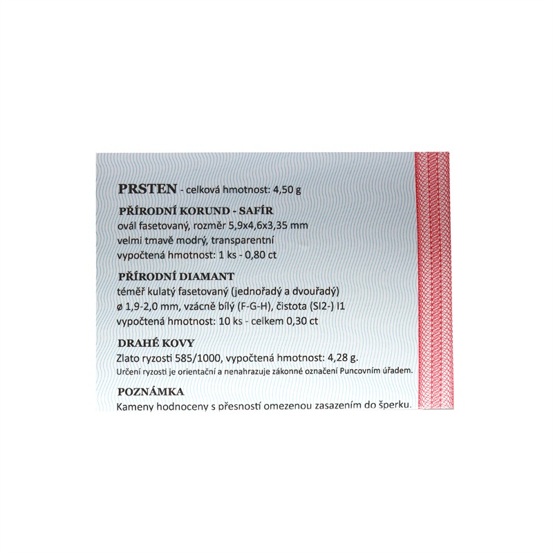 14 karátové zlato 585/1000, celková hmotnost 4,50 g | PŘÍRODNÍ SAFÍR: - velmi tmavě modrý, transparentní 5,9 x 4,6 x 3,35 mm - 1 ks: 0,80 ct | PŘÍRODNÍ DIAMANT: - vzácně bílý F-G-H/ SI2 - 10 ks: 0,30 ct | 2.polovina 20.století | Velikost prstenu 54,5 | Přiložen CERTIFIKÁT PRAVOSTI | Kameny zkontrolovány v gemologické laboratoři
