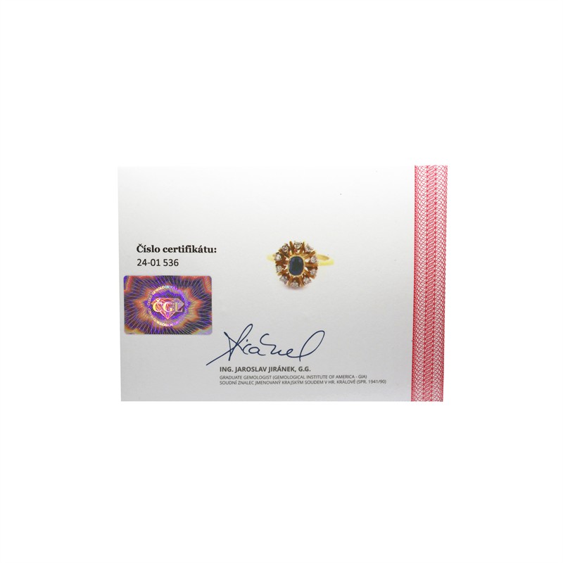 Zlatý prsten s přírodním safírem a brilianty + certifikát