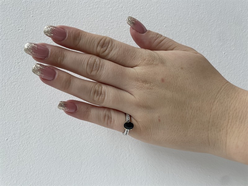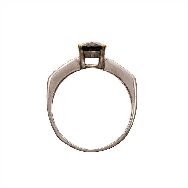 Materiál: bílé zlato o ryzosti 585/1000 Hmotnost: 3,8 g Rozměry: velikost prstenu 52,5, míry kamene 0,8×0,6 cm Drahokamy: • 1 ks přírodního safíru 1,00 ct • 6 ks přírodních diamantů, briliantového brusu, celková hmotnost cca 0,15 ct, kvalita Wesselton / SI
