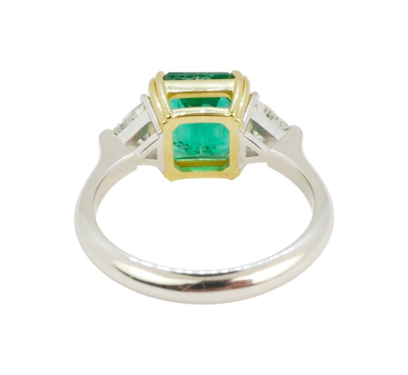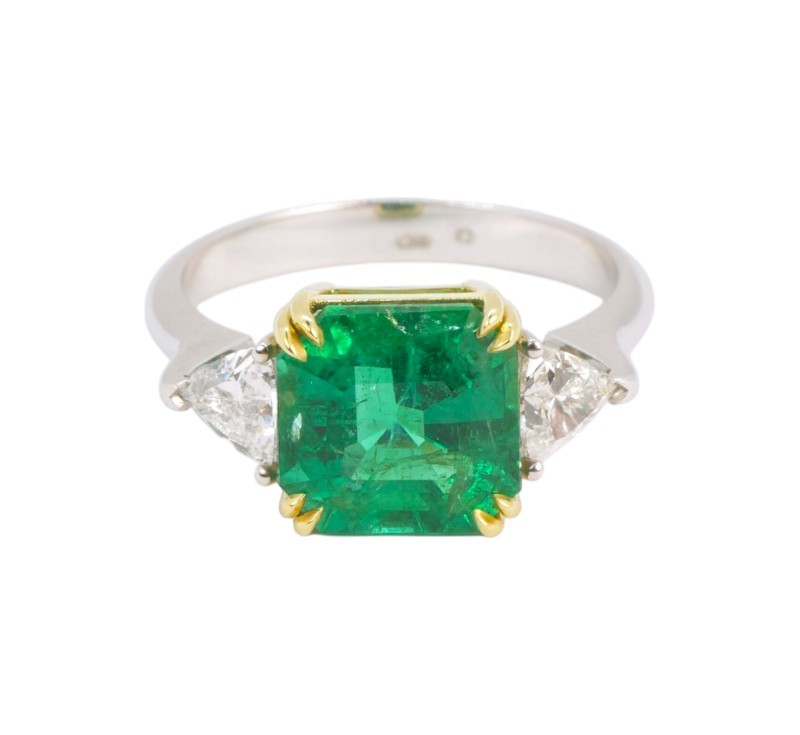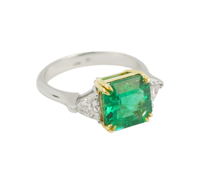 Luxusní prsten moderního, čistého designu je zhotoven v kombinaci bílého a žlutého zlata ryzosti 585/1000 a dominuje mu smaragd výjimečných parametrů, především atraktivní velmi syté zelené barvy. Ten po stranách doplňují laboratorně pěstované diamanty (LAB GROWN) trojúhelníkového brusu, celkové hmotnosti 1 ct. Ke smaragdu byl v gemologické laboratoři AIG vyhotoven certifikát, který je k dispozici. Zde jsou přesně specifikovány parametry kamene: 3,15 ct, rozměry 9,08 x 8,88 x 6,01 mm, brus oktagon, barva Vivid Green, původ Zambie. Prsten je nový, nenošený a bude ideální volbou pro náročnou ženu, která hledá investiční šperk s výrazným charakterem a nezaměnitelnou barvou nejkvalitnějšího smaragdu.