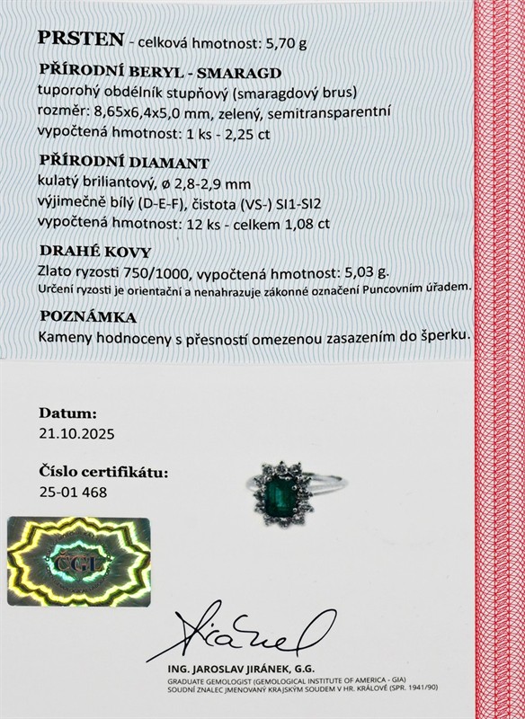 Materiál: bílé zlato o ryzosti 750/1000 Hmotnost: 5,70 g Rozměry: velikost prstenu 59, míry hlavy 1,5x1,2 cm Drahokamy: - 12 ks přírodních kulatých briliantových diamantů, celkem 1,08 ct, výjimečně bílý (D–E–F), čistota (VS) SI1-SI2, průměr 2,8-2,9 mm - 1 ks přírodní smaragd, celkem 2,25 ct, tuporohý obdélník stupňový, zelený, semitransparentní, rozměr 8,65x6,4x5,0 mm Stav: výborný Doklady: Osvědčení Puncovního úřadu České republiky Certifikát z gemologické laboratoře je součástí šperku Pro vaše maximální pohodlí nabízíme kompletní zlatnický servis: úpravy velikosti, odborné opravy, rhodiování, výměny kamenů, profesionální čištění, leštění i znalecké odhady. Vše přizpůsobíme vašim přáním.