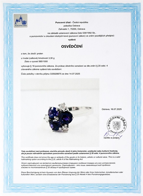 Zlato o ryzosti 585/1000 váha 3,30 g míry hlavy 1,1 x 1,1 cm přírodní ametysty 3 ks 1,10 ct přírodní diamanty 3 ks 0,18 ct velikost 52 výborný stav osvědčení puncovního úřadu kameny s garancí pravosti zkontrolované v gemologické laboratoři