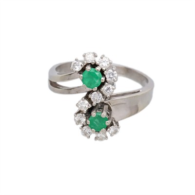 14 karátové bílé zlato 585/1000, celková hmotnost 7,07 g | Přírodní smaragdy 0,30 ct | Přírodní diamanty briliantového brusu 0,40 ct | Velikost prstenu 63 (lze upravit) | Velmi dobrý stav | 80.léta | Kameny zkontrolovány v gemologické laboratoři
