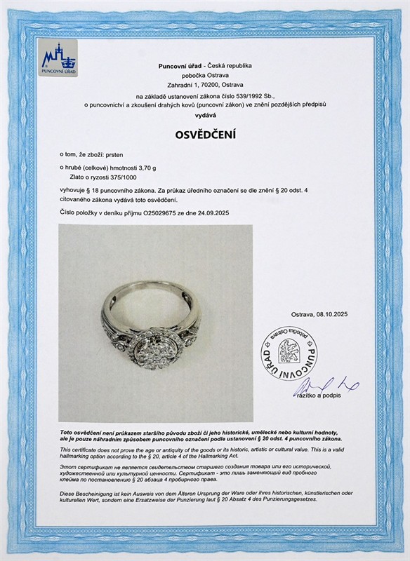 Materiál: bílé zlato o ryzosti 375/1000 Hmotnost: 3,70 g Rozměry: velikost prstenu 52,5, průměr hlavy 1 cm Drahokamy: 7 ks přírodních diamantů, celkem 0,35 ct, vzácně bílý (F-G-H), čistota SI1-I1, průměr 2,3 mm 6 ks přírodních diamantů, celkem 0,05 ct, vzácně bílý (F-G-H), čistota I2, průměr 1,2-1,3 mm 34 ks přírodních diamantů, celkem 0,17 ct, vzácně bílý (F-G-H), čistota I1-I2-I3, průměr 0,9-1,3 mm Stav: výborný Doklady: Osvědčení Puncovního úřadu České republiky Certifikát z gemologické laboratoře je součástí šperku Pro vaše maximální pohodlí nabízíme kompletní zlatnický servis: úpravy velikosti, odborné opravy, rhodiování, výměny kamenů, profesionální čištění, leštění i znalecké odhady. Vše přizpůsobíme vašim přáním.