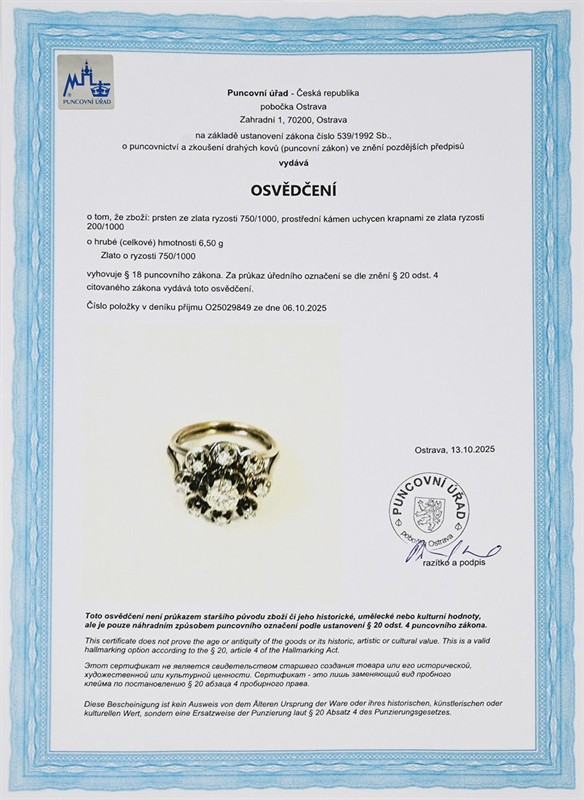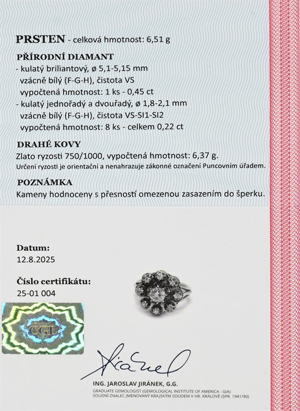 Materiál: bílé zlato o ryzosti 750/1000 Hmotnost: 6,50 g Rozměry: velikost 50, průměr hlavy 1,5 cm Drahokamy: 1 ks přírodní diamant, 0,45 ct celkem, vzácně bílý (F-G-H), čistota VS, průměr 5,1-5,15 mm 8 ks přírodních diamantů, 0,22 ct celkem, vzácně bílý (F-G-H), čistota VS-SI1-SI2, průměr 1,8-2,1 m Stav: výborný Doklady: Osvědčení Puncovního úřadu České republiky Certifikát z gemologické laboratoře je součástí šperku Pro vaše maximální pohodlí nabízíme kompletní zlatnický servis: úpravy velikosti, odborné opravy, rhodiování, výměny kamenů, profesionální čištění, leštění i znalecké odhady. Vše přizpůsobíme vašim přáním.