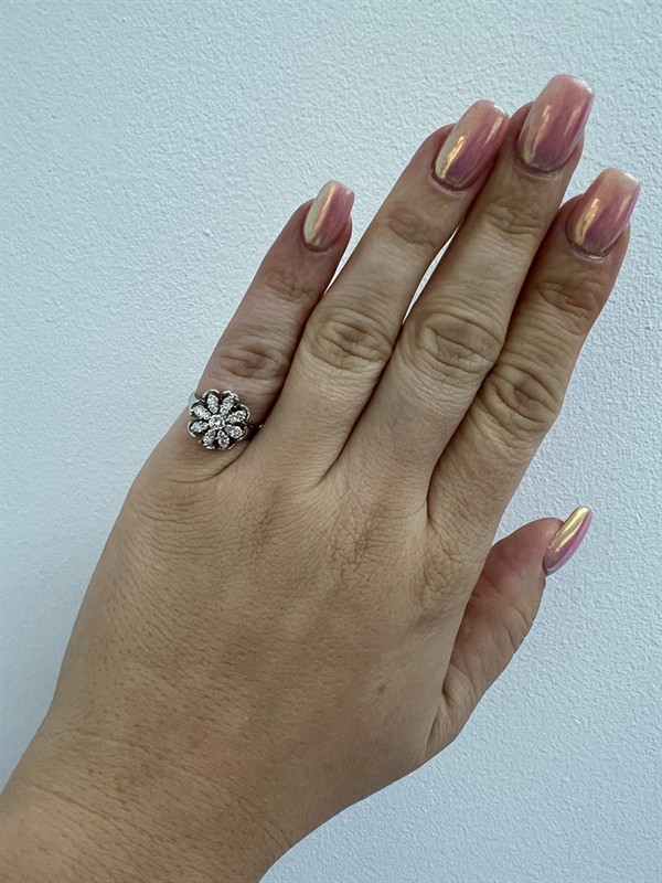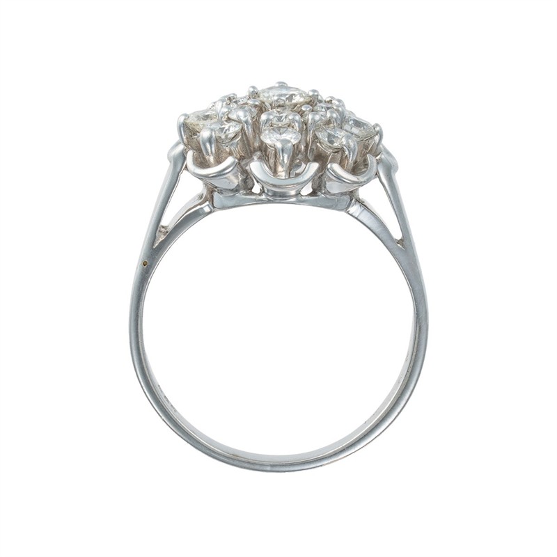 Bílé zlato o ryzosti 585/1000 váha 3,53 g přírodní diamant 1 ks 0,13 ct, lehce tónovaný bílý (I-J-K), čistota VS přírodní diamanty 16 ks 0,56 ct, bílý (G-H-I), čistota SI1-SI2 velikost 48 průměr hlavy 1,3 cm puncované platným puncem certifikát z gemologické laboratoře je součástí šperku