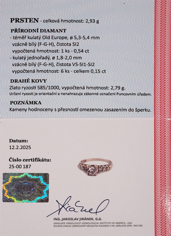 Materiál: bílé zlato o ryzosti 580/1000 Hmotnost: 2,95 g Rozměry: velikost 52 Datace: 1940 Drahokamy: • 1 ks přírodního diamantu Old Europe 0,54 ct, vzácně bílý (F-G-H), čistota SI2, průměr 5,3-5,4 mm, • 6 ks přírodních diamantů, celková hmotnost 0,15 ct, vzácně bílé (F-G-H), čistota VS-SI1-SI2, průměr 1,8-2,0 mm Doklady: • Osvědčení Puncovního úřadu České republiky • Certifikát z gemologické laboratoře je součástí šperku Pro vaše maximální pohodlí nabízíme kompletní zlatnický servis: úpravy velikostí, opravy, rhodiování, výměnu kamenů, profesionální čištění, leštění i znalecké odhady.