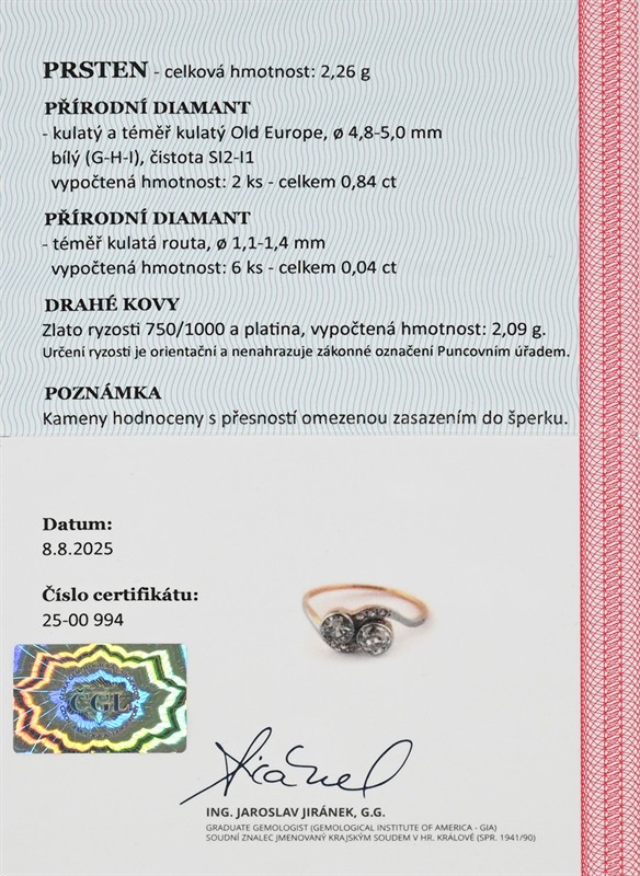 Materiál: žluté zlato o ryzosti 750/1000 Hmotnost: 2,25 g Rozměry: velikost 56, míry hlavy 1,1 × 0,6 cm Drahokamy: 2 ks přírodních diamantů Old Europe, celková hmotnost 0,84 ct, bílý (G–H–I), čistota SI2–I1, průměr 4,8–5,0 mm, 6 ks přírodních diamantů, celková hmotnost 0,04 ct, kulatý briliantový brus, průměr 1,1–1,4 mm Stav: výborný Doklady: Osvědčení Puncovního úřadu České republiky Certifikát z gemologické laboratoře je součástí šperku Pro vaše maximální pohodlí nabízíme kompletní zlatnický servis: úpravy velikosti, odborné opravy, rhodiování, výměny kamenů, profesionální čištění, leštění i znalecké odhady. Vše přizpůsobíme vašim přáním.