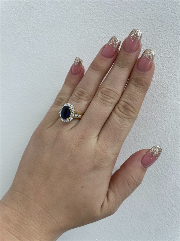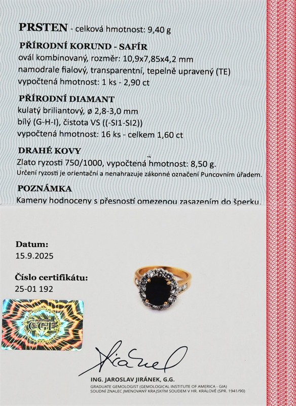 Materiál: žluté zlato o ryzosti 750/1000 Hmotnost: 9,40 g Rozměry: velikost 54, míry hlavy 1,5x1,2 cm Drahokamy: 16 ks přírodních diamantů, 1,60 ct celkem, bílý (G-H-I), čistota VS (-SI1-SI2), průměr 2,8–3,0 mm 1 ks přírodní safír, 2,90 ct celkem, ovál 10,9x7,85x4,2 mm Stav: výborný Doklady: Osvědčení Puncovního úřadu České republiky Certifikát z gemologické laboratoře je součástí šperku Pro vaše maximální pohodlí nabízíme kompletní zlatnický servis: úpravy velikosti, odborné opravy, rhodiování, výměny kamenů, profesionální čištění, leštění i znalecké odhady. Vše přizpůsobíme vašim přáním.