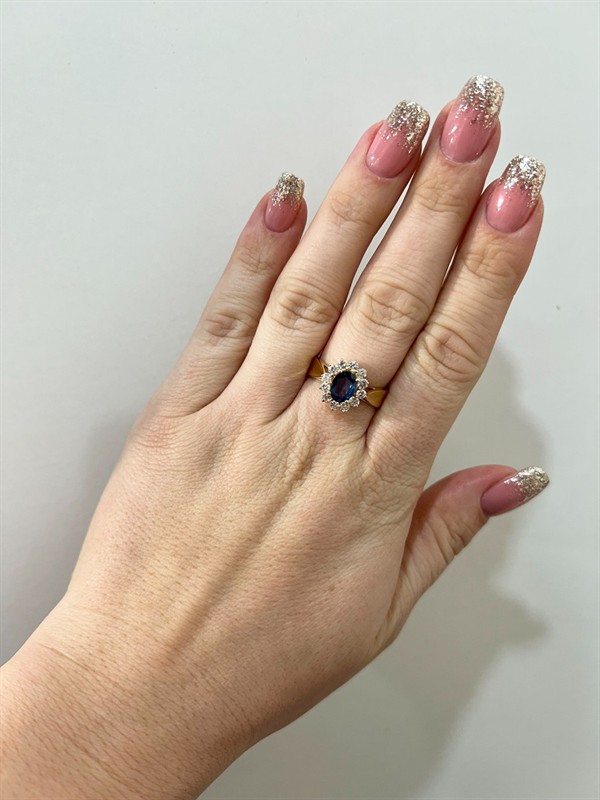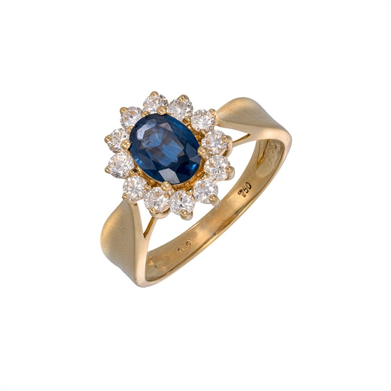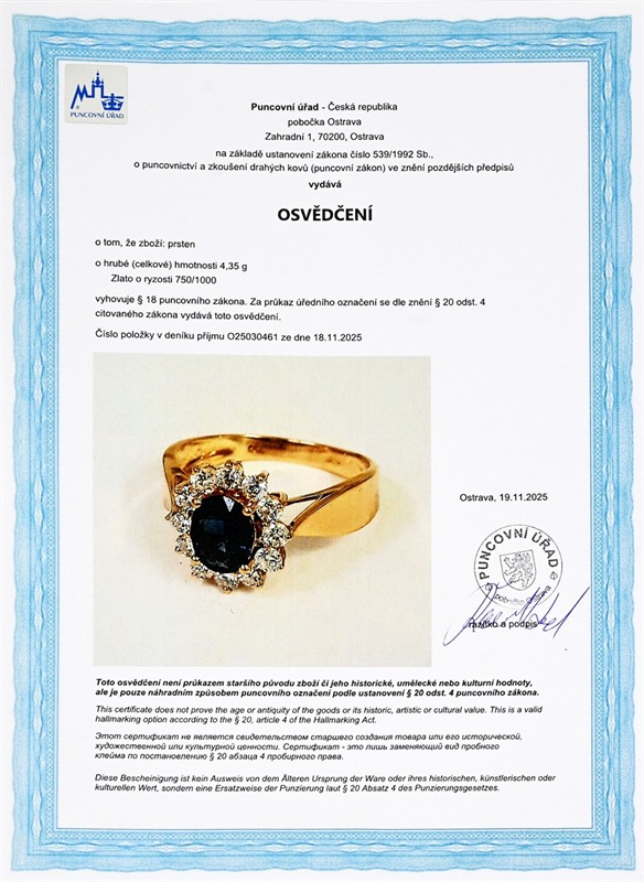 Materiál: žluté zlato o ryzosti 750/1000 Hmotnost: 3,68 g Rozměry: velikost 60, míry hlavy 1,3x1,1 cm Drahokamy: 12 ks přírodních diamantů, 0,74 ct celkem, bílý (G-H-I), čistota SI2, průměr 2,40–2,60 mm 1 ks přírodní safír, 1,10 ct celkem, ovál 8,0x6,0 mm Stav: výborný Doklady: Osvědčení Puncovního úřadu České republiky Certifikát z gemologické laboratoře je součástí šperku Pro vaše maximální pohodlí nabízíme kompletní zlatnický servis: úpravy velikosti, odborné opravy, rhodiování, výměny kamenů, profesionální čištění, leštění i znalecké odhady. Vše přizpůsobíme vašim přáním.